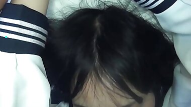 "Cute girl wearing Japanese Schoolgirl uniform dry humping him till he cums in his underwear grinding doggystyle"