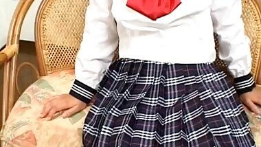 "Ai Kazumi in school uniform sucks cock and gets banana in pussy"